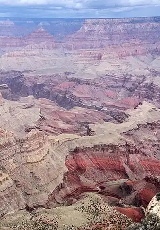 The Hakatai Shale is a Mesoproterozoic rock formation with important exposures in the Grand Canyon, Coconino County, Arizona. It consists of colorful strata that exhibit colors varying from purple to red to brilliant orange. These colors are the result of the oxidation of iron-bearing minerals in the Hakatai Shale. It consists of lower and middle members that consist of bright-red, slope-forming, highly fractured, argillaceous mudstones and shale and an upper member composed of purple and red, cliff-forming, medium-grained sandstone. Its thickness, which apparently increases eastwards, varies from 137 to 300 m (449 to 984 ft). In general, the Hakatai Shale and associated strata of the Unkar Group rocks dip northeast (10–30°) toward normal faults that dip 60° or more toward the southwest. This can be seen at the Palisades fault in the eastern part of the main Unkar Group outcrop area (below East Rim). In addition, thick, prominent, and dark-colored basaltic sills and dikes cut across the purple to red to brilliant orange strata of the Hakatai Shale.[3][4][5]