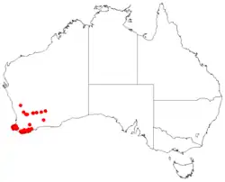 It is endemic to an area along the coast in the South West and Great Southern regions of Western Australia between around Busselton and Albany and with a small population isolated in the Stirling Range around Cranbrook. It is found in winter wet depressions and other damp areas growing in peaty-sandy or sandy-clay soils.[3] The shrub is often part of the understorey in jarrah forest or open Eucalypt woodland communities.[4]