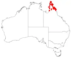 Hakea pedunculata grows north of Cooktown on Cape York Peninsula and on adjacent islands. It is often found in landward edges of mangroves or semi-swamp areas in low shrubland where Melaleuca is dominant.[2]