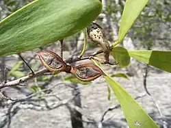 The woodiness of Hakea is determined when the fruit ripens and the two valves open displaying a darker and lighter zone. Most Hakea seed are usually dispersed by an environmental trigger rather than when seed matures, quite often by fire. Whilst other species may require sporadic flooding rains to establish. Those species with a greater pale layer tend to retain their seed longer. Hakea pedunculata is unique in the Pedunculata group for its fruit woodiness and swampy habitat.[8]