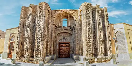 The Hakim Mosque was built over the ruins of a Deylamid mosque, known as Jorjir, that dates from the 10th century CE. Jorjir was commissioned by the Buyid minister, Sahib ibn Abbad, and portions can be seen on the northwestern part of the current mosque structure. The remaining portal of the ruined mosque was hidden for centuries and was accidentally discovered in 1957 when the wall of the Safavid mosque was washed away by rain.[5]