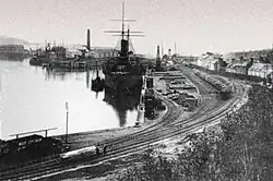 Work was completed on the wooden structure in 1889, and it saw service as the alighting point for passengers embarking to North America, most notably the Gaspesia.[1] It also welcomed passengers disembarking from New York, the inaugural voyage being the City of Rome in 1889.[5] Its proximity to Milford Haven railway station, and the fact that transatlantic trade did not develop at the port, meant that the station was quickly dismantled and absorbed into the Milford Haven Docks complex.[3] The track was later used for freight traffic servicing the fishing industry.