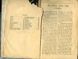 After the publishing of Hakka New Testament in Shantou in the 1920s, the church in Taiwan sent Pastor Chung Tien-zhi,[22] a Hakka from Miaoli County, to Shantou and began learn the Romanized Cantonese alphabet. This learning experience enabled him to help the Taiwan Hakka Christians to compile their own dialect version of the Bible. Pastor Chung brought the Shantou Hakka Bible copies to Taiwan, but the substantial variances between the Hakka dialects, the Taiwanese Hakka population were unable to fully adopt it, and the low reception resulted in fewer people during that period ever becoming aware of the existence of the Shantou Hakka Bible version.[23]