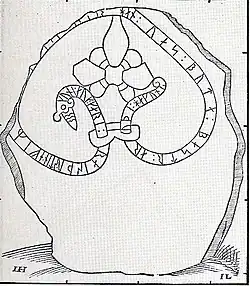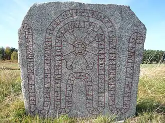This runestone is also called the Bro Runestone after the church by which it is located. It is raised by the same aristocratic family as the Ramsund carving and the Kjula Runestone, which allows scholars to study the family of the Hakon Jarl who is mentioned on this runestone.[3] He is considered to have been Swedish and his son Özurr may have been responsible for organizing the local defense organization against raiders on the shores of lake Mälaren.[3] However, the only recorded organization of such a defence is from England and consequently both this Hakon Jarl and his son Özurr may have been active in England in the Þingalið instead.[5] Omeljan Pritsak argues that this Hakon is the same as the one who is mentioned on the Södra Betby Runestone and whose son Ulf was in the west, i.e. in England.[7] This Swedish Hakon Jarl would then actually be the Norwegian Hákon Eiríksson.[7]