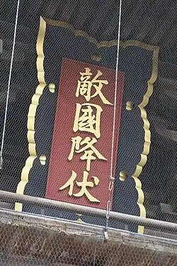 During the first Mongol invasion on November 19, 1274 (Bun'ei 11, 20th day of the 10th month), the Japanese defenders were pushed back from the several landing sites.[3] In the ensuing skirmishes, the shrine was burned to the ground.[4] When the shrine was reconstructed, a calligraphy Tekikoku kōfuku (敵国降伏; surrender of the enemy nation) was put on the tower gate. The calligraphy was written by Emperor Daigo, dedicated by Emperor Daijo Kameyama as a supplication to Hachiman to defeat invaders.