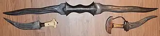 The haladie is a double-edged dagger from ancient India,[1] consisting of two curved blades,[1] each approximately 8.5 inches (22 cm) in length,[1] attached to a single hilt.[2]