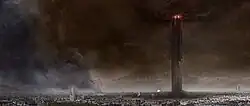 Suddenly, CP officers appear and fire on the Resistance members. The two retaliate with their own weaponry (Derek using a 9mm pistol, then a crowbar found hanging on a handrail; Ian using an SMG with a grenade launcher) and manage to escape. They are eventually caught upon an open stretch of railway, where a Hunter-Chopper appears and fires at them, giving chase. The duo disappear behind a cloud of dirt from the wake of the chopper's mounted gun, and the film abruptly cuts to black.[1]