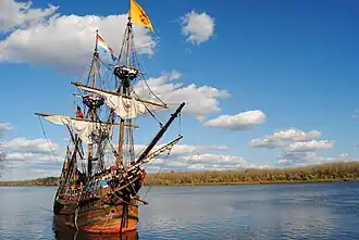 Half Moon is a replica of Halve Maen, the famed ship that English mariner Henry Hudson sailed up the Hudson River in 1609. The ship was constructed between 1988 and 1989 at the Snow Dock in Albany, New York, its construction commissioned by Dr. Andrew Hendricks.[1] The ship's construction fulfilled Dr. Hendricks' dream to use the historic icon as an educational instrument, bridging the gap between the American way of life and the Dutch heritage in New York state. In March 2015, the replica ship departed the Hudson River Valley to a new home, Hoorn, The Netherlands.[2] In February 2019, it was announced that the Hoorn government would not extend their contract to serve as the Dutch homeport of the Half Moon. Hoorn's contract expired on April 1, 2020.[3] The Half Moon is currently at port in Kampen, Netherlands. The board of directors of the New Netherland Museum have not announced what the future of the ship may hold.[4]