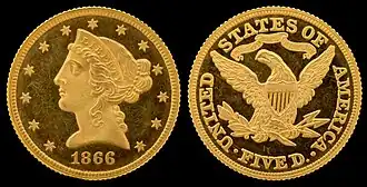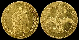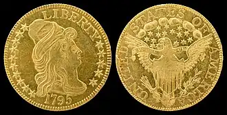 The half eagle is a United States coin that was produced for circulation from 1795 to 1929 and in commemorative and bullion coins since 1983. Composed almost entirely of gold, its face value of five dollars is half that of the eagle coin. Production of the half eagle was authorized by the Coinage Act of 1792, and it was the first gold coin minted by the United States.