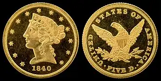 In 1839 the coin was redesigned again. The new obverse was designed by Christian Gobrecht and is known as the "Liberty Head or "Coronet head". The reverse design remained largely the same, although the value was changed from "5 D." to "FIVE D.".
