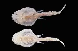 Halieutopsis andriashevi has a comparatively small disc with the edge of the disc being much shorter and a narrower cranium in relation to its standard length with relatively small eyes too.[6] The disk margin is equivalent to 34.4–38.2% of the standard length.[7] The tubercles along the margin of the disc and the sides of the caudal peduncle are vertically flattened and touch one another to create continuous, serrated ridges. The ridges on the sides of the caudal peduncle are even, reaching either side of the caudal fin to resemble keels. The esca is only slightly protruding from the illicial cavity, and slopes forward at an obtuse angle. The gill rakers are slender, triangular plates positioned at tight angle to the gill arch, each with very small teeth in a patch on the distal end. The pelvic and pectoral fins are relatively small, with the pectoral bases united with body by a membrane. The dorsal and anal fin each contains 4 soft eays with the last ray in each fin connected to the body by a membrane.[6] The colour of the preserved specimens is light brown to creamy white, rather translucent with thin skin.[7] The standard length of the type specimen, a female, is 4.6 cm (1.8 in).[6]