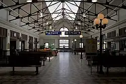 The station building was renovated at a cost of C$1.6 million over six months in 1988, a project that restored many of the original heritage features. The passenger waiting area was increased in size, from 5,000 square feet to over 8,500 square feet. The false ceiling was removed, exposing the original 24-foot ceiling, which was restored along with the original skylight. The station building was officially reopened on 20 June 1988 by Halifax member of parliament Stewart McInnes, Halifax mayor Ron Wallace, and VIA Rail president Denis de Belleval.[2]