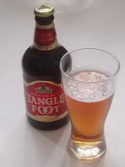 Tanglefoot is a golden ale, 4.7% as a cask ale, and 5.0% as a filtered beer in bottles and cans. It is made from a mix of English Flagon barley, Goldings and Challenger hops, with a pear drop taste. According to a story presently written on the bottle, it was given its name when the head brewer drank "several tankards" and "fell on" a name for the beer.[4] The cask version is widely available in the south of England, and a pasteurised version is available in bottles and cans in supermarkets nationally.