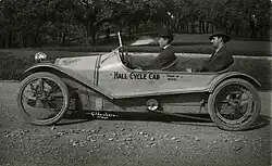 In 1914, a man named John B. Fisher designed a cyclecar for the Hall Cycle and Plating Company. It had an underslung frame. Lawrence Hall, president of the company, did a test run from Waco to Dallas, covering 104 miles while consuming only 2.5 gallons of gasoline. The cyclecar had a 4-cylinder, 18 hp engine(the prototype only had a two-cylinder engine) with a 100" wheelbase. The company reorganized in 1915 as the Hall Motor car Company.[2] Production ended in 1915, and Lawrence Hall moved to Los Angeles.[3]