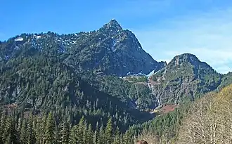 Hall Peak is a 5,484-foot (1,672-metre) mountain summit located in the South Fork Stillaguamish River Valley near the western edge of the North Cascades, in Snohomish County of Washington state.[3] It is located 5 miles (8.0 km) northwest of Barlow Pass along the Mountain Loop Highway, near the Monte Cristo area, on land administered by the Mount Baker-Snoqualmie National Forest. Its nearest higher peak is Big Four Mountain, one mile to the south-southwest. Both mountains can be prominently seen from the Big Four picnic area, where the trail to the Big Four Ice Caves starts. The peak is named for mining prospector George Hall, who in 1891, discovered the Forty Five claim.[4][5]