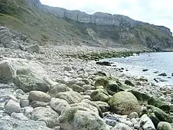 Tar Rocks are located near the bay. They are the relics of an ancient landslide, with the majority often hidden at high tide.[7] The British cargo steamer SS Thames was wrecked at Tar Rocks in 1891, after being driven ashore in fog.[8][9] In 1930, SS Barmston, a collier, was also shipwrecked at the site and became a total loss.[10]