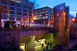 Hallidie Plaza is a public square located at the entrance to Powell Street Station (the third-busiest BART station as of 2015[1]) on Market Street in the Union Square area of downtown San Francisco, California, United States. Hallidie Plaza was designed jointly by Lawrence Halprin, John Carl Warnecke, and Mario Ciampi and opened in 1973.[2] In 1997, a perforated stainless steel-screened elevator was added to provide access to the plaza and station for disabled people.