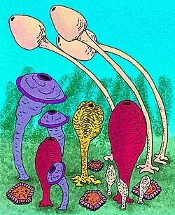 Hallirhoidae is an extinct family of heteroscleromorph demosponges found throughout the world from the Cretaceous to the Eocene, whereupon they became extinct.[1] The highest concentration of species occurred in the Tethys Ocean during the upper Cretaceous. The hallirhoid demosponges were very distinctive-looking, largely pear-shaped sponges that were attached to the seafloor by a long stem-like stalk.[2][3]