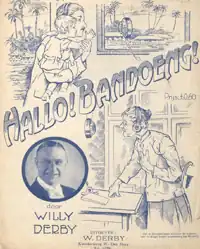 "Hallo Bandoeng" is a song by the Dutch levenslied singer Willy Derby (real name: Willem Frederik Christiaan Dieben, 1886-1944). It was released in 1929 and sold more than 50,000 copies, an astronomical number for that time.[1] It was one of Derby's songs that became part of Dutch culture.[2] The phrase "Hallo Bandoeng" was well known at that time, as the usual opening used by Radio Kootwijk when establishing a connection with Bandung (in Dutch: "Bandoeng"), one of the most important cities in the then Dutch East Indies.[3]