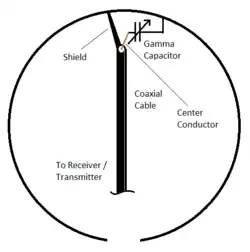 - ^ A "one-armed" standard gamma match, providing an unbalanced feed, as opposed to a balanced "two-armed" 'T'-match (a gamma match for each side of the feedpoint). The use of an unbalanced gamma match is only a typical feature of modern halos; it is not essential to its design. There are other, less common methods of feeding halos that work just as well, or even better, and any type of feed can support a grounded halo, if the halo's connection to the supporting mast is placed (as shown in the illustrations) at the electrically neutral center of the loop(s) and has a connection to ground through the mast.