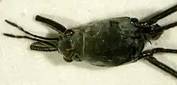 The eggs (1 mm long) are laid on flotsam, such as seabird feathers, driftwood, or plastic, but eggs may even be laid on juvenile members of the same species; these are olive when fresh and turn orange after a few days.[1] Development might take up to a month at 20 °C (68 °F), after which the nymph punctures the chorion with a chitinized "egg-burster", and extracts itself from the egg which takes around 3 minutes; eggs hatch together in intervals, which is likely a method to reduce the risk of predation on the vulnerable nymphs.[1] The young are similar in morphology to adults, with the nymphs of the first instar being pale brown instead of dark grey; these reach maturity after 5 moults, with the sexes of immature animals being indistinguishable. Generational length is likely longer than two months.[3][2][5] Individuals which were about to molt appeared sluggish and stopped feeding, teneral nymphs are pale-yellow to off-white. The speed of development is likely based on ambient temperature.[1]