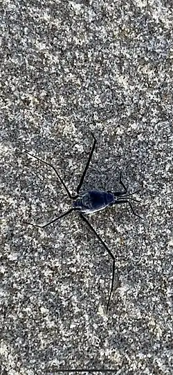 As a member of the genus Halobates, it lives out its entire life in marine environments; specifically, it is one of five Halobates species that live on the surface of the open ocean, only occurring near the coast when storms blow them ashore;[1] the other species are H. germanus, H. sericeus, H. sobrinus, and H. splendens. Halobates micans have body lengths (head to abdomen) of around 3.6–4.5 mm (0.14–0.18 in), with males being bigger than females and their appendages extending beyond this.[2]