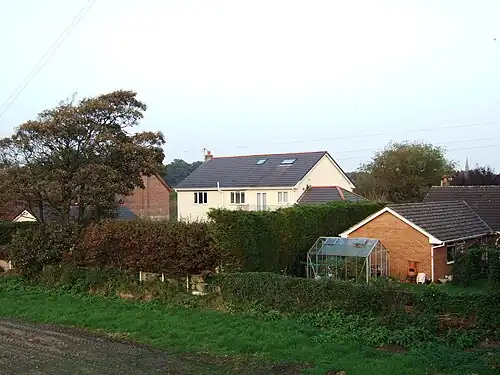 The site of Halsall railway station in 2007. The white house in the centre, now a private residence, is the old station building. The track ran parallel to the edge of the field | |||||