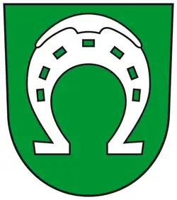 The former coat of arms depicts a downfacing silver horseshoe with a toe cap and seven rectangular nail holes on a green background.