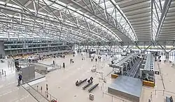 Hamburg has two interconnected terminals, Terminal 1 (used by most airlines including those of Oneworld and SkyTeam) and Terminal 2 (Star Alliance), connected by the Airport Plaza and the baggage claim area that extends through the lower levels of all three buildings. In all buildings level 1 is the departure level with overall 44 departure gates, while level 0 is arrivals and also features ten additional bus gates.[14] Hamburg Airport offers 12 baggage claim belts on the arrivals level. The Airport Plaza hosts the central security check as well as shops, restaurants, lounges and other service facilities. It also houses the suburban railway station.[14]