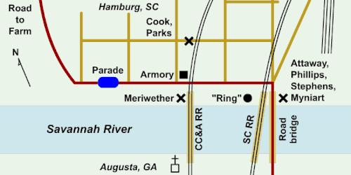 Hamburg was a market town populated by a majority of freed blacks in Aiken County, across the Savannah River from Augusta, Georgia. Aiken was the only county in the state to have been organized during the Reconstruction era.[2] Following the end of the War, the defunct market town was repopulated by freedmen. (It had been made obsolete by the expansion of the South Carolina Railroad into Augusta.) Many blacks in the postwar period moved from rural areas to cities to escape white violence and gain safety in their own communities.