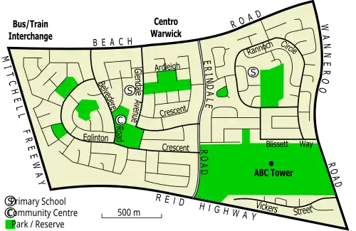 The restricted-access bushland reserve surrounding the ABC radio tower in the suburb's southeast covers 14.4% (0.47 km2 or 120 acres) of its area,[10] while parks and areas of natural bushland are spread throughout. The largest of these are Aintree-Eglinton Reserve, a 3.38-hectare (8.4-acre) grassed reserve next to the community centre complex, and Rannoch-Tay-Earn Reserve, a 4.83-hectare (11.9-acre) reserve containing large areas of native bushland interspersed with grassed and paved walkways. A biodiversity site north of the community centre is recognised by the City of Stirling's Green Plan 2.[11]