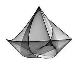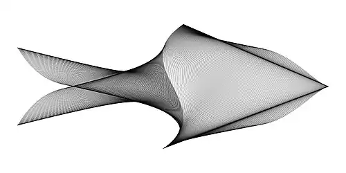 Naderi Yeganeh has introduced two methods to draw real-life objects with mathematical formulas.[4] By the first method, he creates tens of thousands of computer-generated mathematical figures to find a few interesting shapes accidentally. Then he changes the equations a little bit in order to increase the resemblance of the accidentally found shapes to real life objects.[46][47][48] For example, by using this method, he found some shapes that resemble birds, fishes and sailing boats.[49][50][51][52] In the second method, he draws a real life object with a step-by-step process. In each step, he tries to find out which mathematical formulas will produce the drawing.[53][4] For example, by using this method, he drew birds in flight, butterflies, human faces and plants using trigonometric functions.[54][55][56][53][57][58] Naderi Yeganeh says: In order to create such shapes, it is very useful to know the properties of the trigonometric functions
