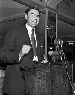 Fish said in his concession speech that his defeat "should be largely credited to Communistic and Red forces from New York City backed by a large slush fund probably exceeding $250,000."[52] In a farewell speech before the House on December 11, 1944, he stated, "It took most of the New Deal Administration, half of Moscow, $400,000, and Governor Dewey to defeat me."[54][55] Fish also stated, "I particularly wanted to be elected to serve as chairman of the Rules Committee to stop the march toward communism and totalitarianism in America. I have no regrets whatever, as I waged the strongest possible fight that I knew how."[56]