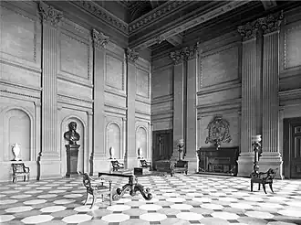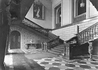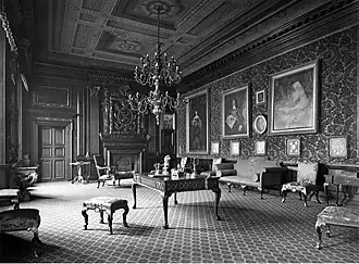In June 1919 the trustees petitioned the Court of Session for authority to sell the contents of Hamilton Palace and then demolish the building.[3][nb 1] The trustees had been advised that the coal workings then in progress beneath the palace would damage and might ultimately destroy the fabric of the palace, and so - with the approval of the 13th Duke - they had decided to demolish it. Permission was granted by the Court of Session on 12 June 1919. At this time, the magazine Country Life featured a number of articles on the palace and a quantity of photographs were taken by A. E. Henson, the magazine's staff photographer, to accompany the series. As such they represent an invaluable record of the palace before the sale of contents and fittings and its demolition.[21]