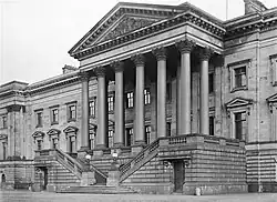 The sale of the Hamilton Palace Collection took place from 4 to 7 November 1919 took place at Christie's. The sale raised £232,847 (equivalent to £13,515,976 in 2023) and included furniture, porcelain, silver plate, tapestries, jewellery and paintings by van Dyck, Rubens, Rembrandt, Reynolds, Romney, Raeburn, Delacroix and Winterhalter. The remaining contents of the palace - 572 lots including wood panelling, furniture, porcelain, carpets, curtains, sculpture and fittings - were sold at the palace from 12 to 14 November 1919, raising £29,000.[22][23] In May 1920 Hamilton Town Council considered purchasing the building from the trustees, with a view to restoring it and converting it into flats for public housing, while in December of that year the Duke and Duchess of Hamilton gifted 22 acres (8.9 hectares) of ground at the south front of Hamilton Palace to the town council for recreational purposes[24][25] In October 1921 the building was sold for £7,500 to the Edinburgh building contractor William D. Lillico for dismantling and demolition, with demolition work commencing in November 1921. The palace was so solidly built that it took far longer to dismantle and demolish than Lillico had expected. When the travel writer H. V. Morton visited Hamilton Palace in 1927 or 1928, he found that the roof had been removed, but that the black marble staircase and the bronze Atlantes were still in place in the now soaking interior. The last sections of the palace were demolished in 1932.[4][5][26] In July 1922 Hamilton Town Council purchased 750 acres (300 hectares) of the Hamilton Estate, including Hamilton Mausoleum, the stables and the riding school, from the trustees for £20,250.[27]