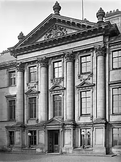 Anne, 3rd Duchess of Hamilton and her husband, William, Duke of Hamilton, commissioned a major rebuilding programme at Hamilton Palace from 1684 to 1701. Dubbed by the Hamilton family as 'The Great Design', these works led to the creation of a U-plan country house, with an open south-facing courtyard which followed the outline of the existing late 16th-century enclosed quadrangle.[6] Under the direction of the architect James Smith, the south quarter of Hamilton Palace was removed entirely, the east and west quarters were rebuilt as courtyard wings, while the north wing was left much as it had been before, although it was refaced and remodelled internally. The south front was rebuilt between 1693 and 1701 in the Baroque style, the principal feature of this new formal ceremonial entrance being the frontispiece with its huge Corinthian portico. Behind the facade of the remodelled north front, the first floor was fully taken up by the 36.6 m (120 ft) Long Gallery, while the first floor of the west wing contained the main suite of ducal apartments.[8]