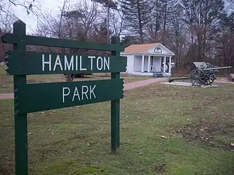 Hamilton Park consists of 93 acres of rolling terrain, bounded on the north by East Main Street, the west by Silver Street Expressway and the Mad River the south by the river and Interstate 84, and the east by Idylwood Avenue, Plank Road, and a residential area. It is entered via a formal entrance at Hamilton Park Road and East Main Street, and a secondary entrance at Idylwood Avenue and East Main Street. The easternmost section of the park is a relatively unimproved wooded area which serves as a bird sanctuary. The western and southern sections are more intensively developed, with formal athletic fields and passive open fields to the south, and several structures in the northwestern parts. The structures include a building built as a dance pavilion but now housing the Seven Angels Theater, and the Liberty House, so named because it was where Liberty Bonds were sold during World War I. Near the center is a small pond, which once served as a swimming hole. At the southern and southeastern edge of the park, abutting Interstate 84, are foundational and archaeological remnants of the Waterbury Brass Mill, the site of one of the city's first brass works.[2]