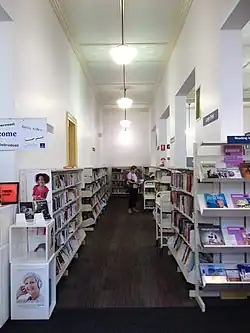 Internally, the Library has been substantially altered by the removal of walls and doorways. However, the "Reliance" strongroom with steel doors remains in working order. The main windows to both street facades are original Diocletian windows and sashes. The interior features shallow coffered ceilings with plaster rose. Picture rails remain in some rooms, and the section of the library with the strongroom is half paneled. The original open verandah to the north of the library has been unsympathetically enclosed with timber boarding and glass louvres.[1]