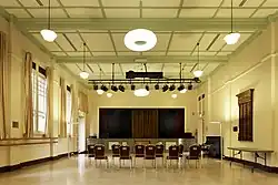 The hall, across the rear of the library, is much more intact and features a fibrous plaster ceiling with coffered timber beams. Two large roof ventilators are built into the hall roof.[1]