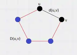 The distance between two vertices in a graph is defined as the minimum of lengths of paths connecting those vertices. The detour distance between two vertices, say, u and v is defined as the length of the longest u-v path in the graph.[1] In the case of a tree the detour distance between any two vertices is same as the distance between the two vertices.
