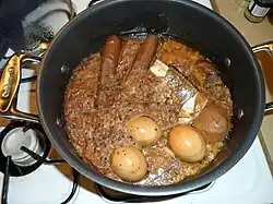 ![]() Haminados eggs (bottom) in hamin stew | |
