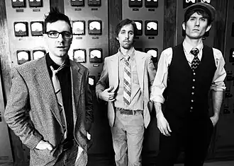 Hammer No More the Fingers is a three-piece rock band from Durham, North Carolina. Formed on January 1, 2007, the band consists of Duncan Webster (vocals, bass), Joe Hall (guitar, vocals), and Jeff Stickley (drums, vocals). The band released a self-titled EP in November 2007, and issued its first full-length album Looking For Bruce on Churchkey Records in April 2009.[1] and on Inhaler Records in February 2010.