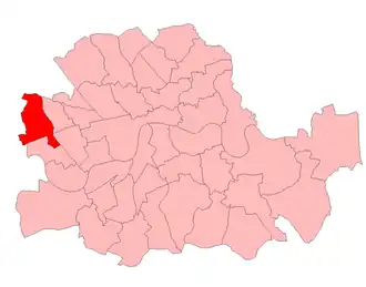 The last redrawing of the boundaries of the constituency took place prior to the February 1974 election. In 1965 the former metropolitan borough had become part of the larger London Borough of Hammersmith, and the seat was defined as consisting of ten wards of the London Borough, namely: Addison, Broadway, Brook Green, College Park & Old Oak, Coningham, Grove, St. Stephen's, Starch Green, White City and Wormholt.[1]
