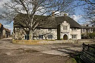 Near St. Paul's is the thatched and mullioned manor house, which dates from the 16th century and which Sir Frederick Treves described in 1906 as "the most picturesque of its kind".[8] It has an L-shaped plan and has had several changes since first construction, including the addition of a classical porch around 1600. According to Pevsner the building overall has "an air [...] of simple innocence under its thatched roof".[9] It is listed by English Heritage as Grade II*.[10]
