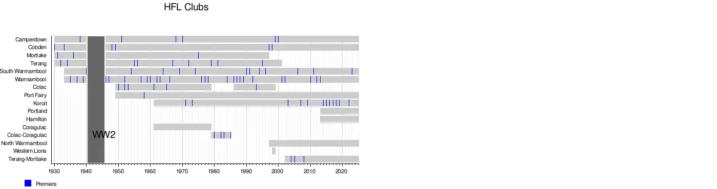 The Hampden Football League was formed in 1930, when the four founding clubs broke away from the Western District FL. Terang and Camperdown did not want to continue to travel to Hamilton because their players were farmers who could not spend all day away from the farm to play football, as they had cows to milk.[1]