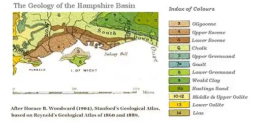 Above the chalk the basin contains Palaeogene sediments ranging from Thanetian (Palaeocene) age to Rupelian (Oligocene) age. The oldest beds, the Lambeth Group ('Reading Beds') and Thames Group ('London Clay') outcrop in narrow bands towards the perimeter of the basin, from the coast at Studland, around the perimeter of the Dorset heathlands,[5] north and east past Romsey, swinging southeast past Eastleigh and eastwards towards Chichester, Worthing and Shoreham-by-Sea. Within this rim, over the greater part of the basin is an outcrop of younger Eocene deposits, the Bagshot, Bracklesham and Barton beds. The youngest, Oligocene beds (Bouldnor Formation) only occur on the northern Isle of Wight; the Headon Hill beds of the New Forest, formerly classified as Oligocene, are now regarded as late Eocene.[4]