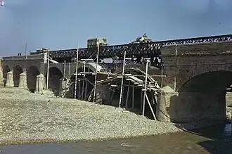 Eighth Army steadily advanced up Italy until it was held at the Germans' Winter Line and stalemate set it. The following Spring, XIII Corps participated in the fourth Battle of Monte Cassino (Operation Diadem) with an assault crossing of the Rapido River on the night of 11 May 1944. The subsequent advance was dependent upon bridges being quickly established across this river, and 577 Field Co was made responsible for building a Class 40 Bailey bridge codenamed 'London' at San Angelo on the front of 8th Indian Division. A camouflaged track (also codenamed 'London') was prepared to bring the bridging material close to the river by night. The bridging operation began after the Indian troops had seized their bridgehead, and went on under cover of a smokescreen, while 8th Indian Division cleared San Angelo. 'London' was completed by 577 Fd Co at 10.30 on 14 May, and two additional Class 40 bridges into 8th Indian Division's bridgehead ('Edenbridge' and 'Tonbridge') were completed by 56 Fd Co at 17.00 and 22.00 respectively. 78th Division, which had been waiting for 'London' to open, crossed the river on 14 May to join in the attack the following day.[57][58] The Official History gives much of the credit for the success of 'Diadem' to the British and Indian engineers.[59]