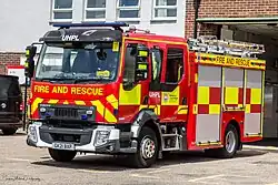 A notable tragedy to affect the service during this time was the deaths of firefighters Jim Shears and Alan Bannon in the Shirley Towers fire on 6 April 2010.[9] Following the period of austerity cuts from 2010, the service has had to reduce costs; this included a £16 million funding gap in the 2015-20 period.[10] The authority's plan to address this while avoiding closing any fire station or issuing any compulsory redundancies included reducing the number of operational firefighters at stations, allowing some engines to respond to minor incidents with a smaller crew and introducing smaller engines at some stations.[11][12] Initially the vision was for three types of fire engine: Enhanced Capability engines, which are similar in size to a traditional fire engine; Intermediate Capability appliances, which are slightly smaller; and First Response Capability appliances, which are much smaller.[12] Following extensive vehicle trials, the decision was made to drop the First Response Capability appliance concept in 2019. The revised vehicle disposition is based on two types of appliance, the Enhanced and Intermediate Capability, now renamed Rescue Pump and Light Rescue Pump respectively.[13]