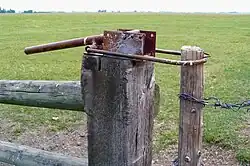 A Hampshire gate occupies a gateway in a fence similar to that used for a conventional gate. However, instead of a rigid gate, a short section of loose wire fence fits into the gap – this may consist of wire netting or barbed wire, and it usually matches the adjacent fence. One end of the wire is attached permanently to the main fence, and two or more short posts or battens keep it upright and flat – one of these is at the loose end. When the "gate" is closed, this end post fits into a loop of wire at the base of the fixed fence, and the top is then pulled tight to tension it. The top of the post may be held by another loop of wire, or additional tension may be provided by a length of chain looped around the post and hooked onto a nail. A lever-lock gate replaces the upper wire loop with a wooden lever.[5] Proprietary closures are also available which give still greater tension, usually by means of an over-centre mechanism (see photo below).