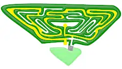 Commissioned by King William III, the maze, which is about one-third of an acre, is planted in a trapezoid shape and was designed by George London and Henry Wise.[2] It was located in the "wilderness" part of the gardens of the palace, of which it is now the only surviving part.[3][4] Planted between 1689 and 1695, the maze is not particularly difficult,[3] taking about 20 minutes for a person to make their way to the middle.[2] It was originally planted in hornbeam, later replaced by yew.[2]